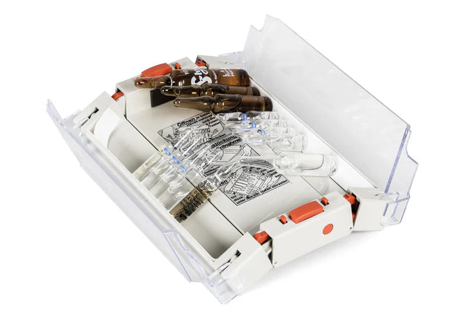Praktický dávkovač ampuliek poskytuje bezpečné a pevné uloženie pre ampulky rôznych veľkostí. Priehľadné viečko umožňuje rýchly prehľad o obsahu a otvára sa automaticky po stlačení tlačidla.